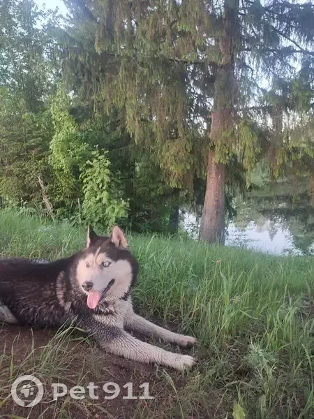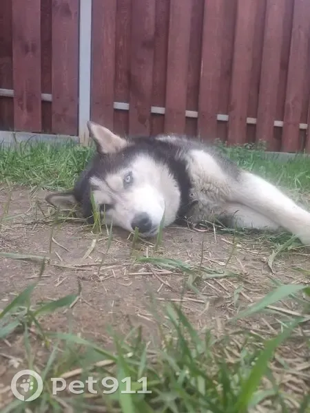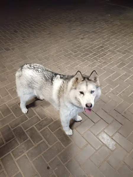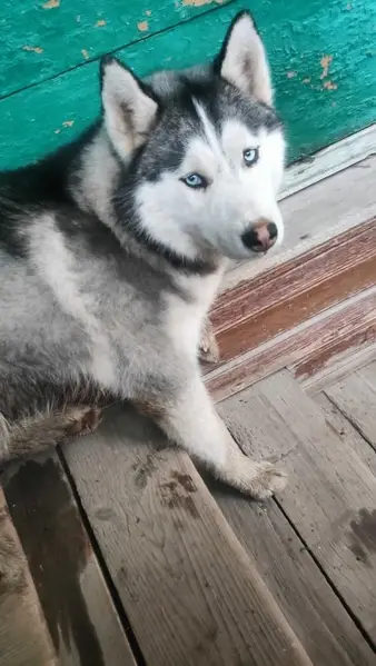 Темно серый,почти черный цвет с белыми пятнами, глаза разные - один голубой, другой коричневый. Возраст 6 лет. Очень добрый. Потерялся без ошейника и поводка.
