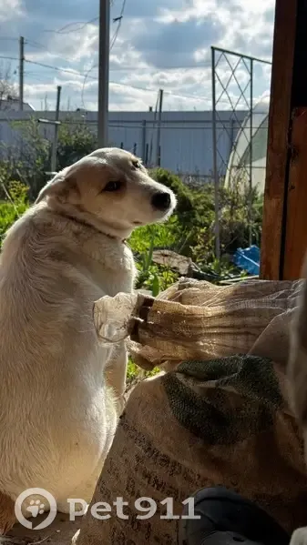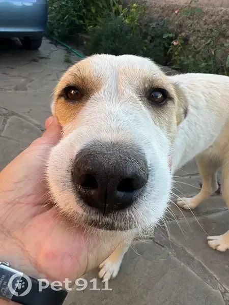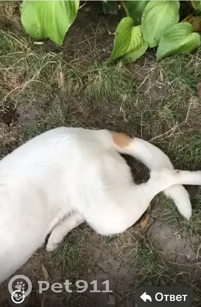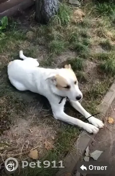 Белая с жёлтыми подпалинами вокруг глаз На хвосте есть пятно желто чёрного цвета Возраст три года Пропала между хутором рыбацким и первыми Алитубскими дачами Убежала во время рыбалки на реке Дон Собака общительная добрая