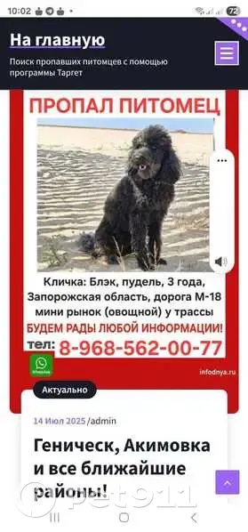 Пудель чёрного цвета, хвост седоватый. Очень-очень доверчивый к людям. Откликается на кличку Блэк. Думали что он запрыгнул в машину, но опомнившись вернулись обратно, но его уже нет. Ребёнок плачет. Пожалуйста, помогите его найти , он наш член семьи. Без него дом пустой.
