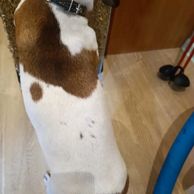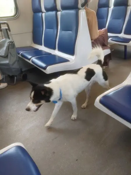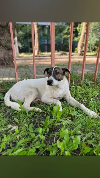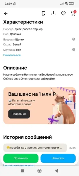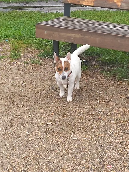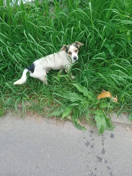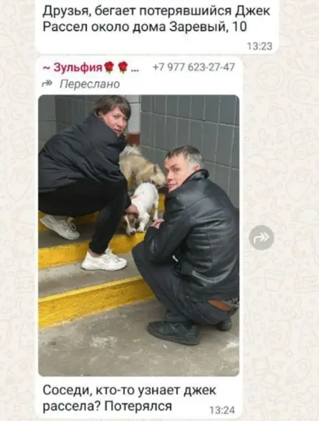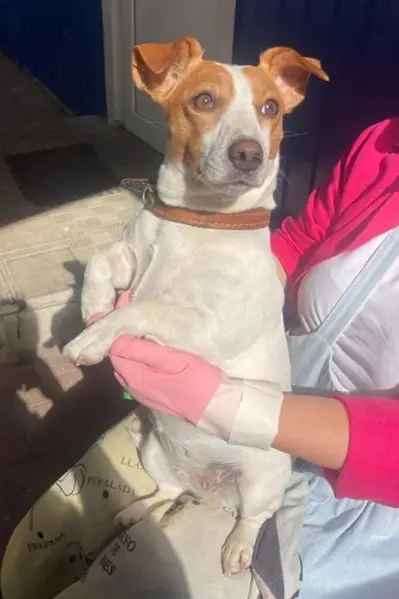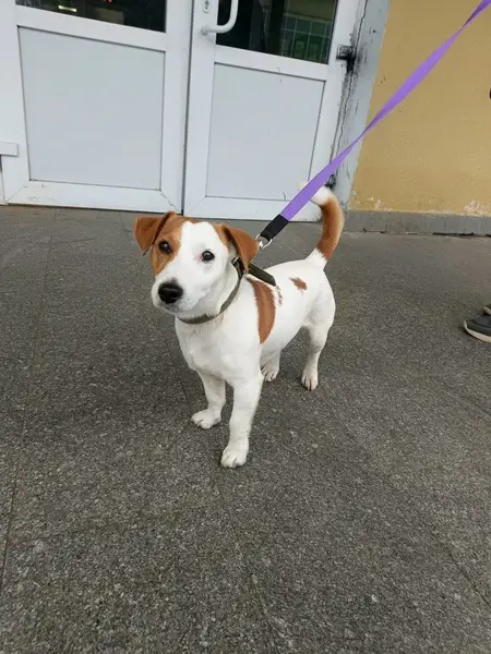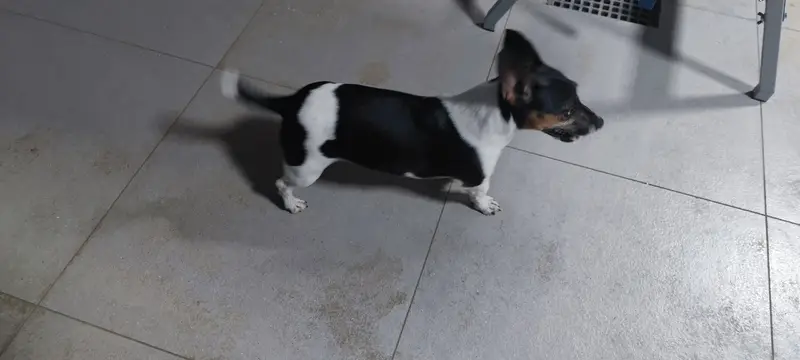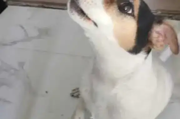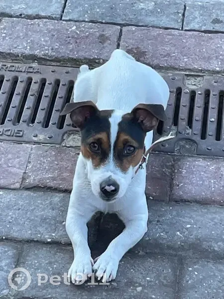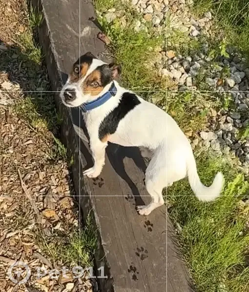 Джек Рассел терьер, триколор, кобель,2 года, на кончике носа белое пятно, правая задняя нога в области бедра немного атрофирована ( удалена головка тазобедренной кости) при ходьбе часто поджимает правую ногу. На нем был темно-синий тесьмяный ошейник. Ластик чипирован. Высота в холке 25 см.