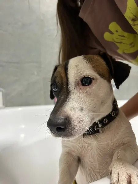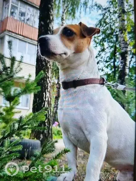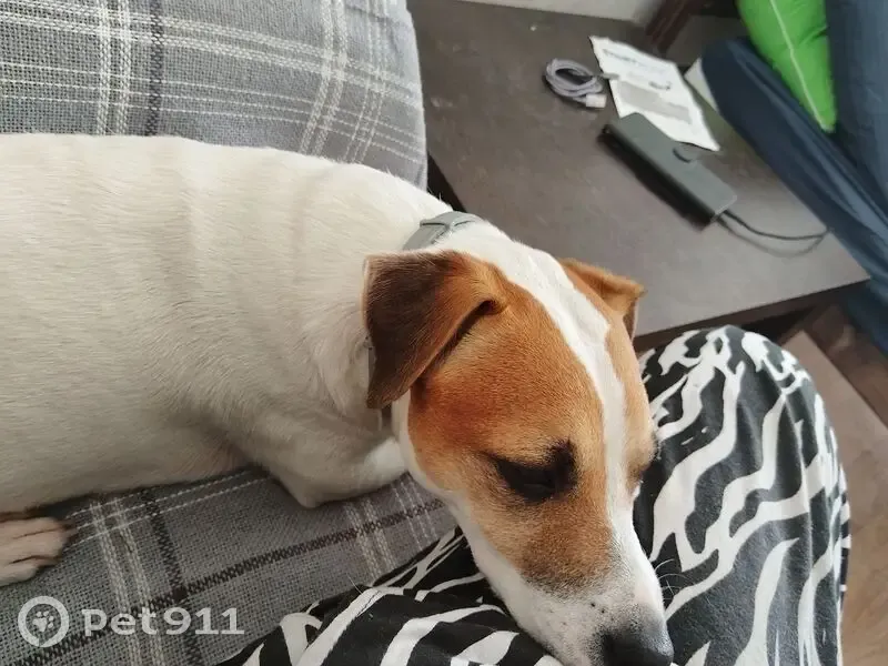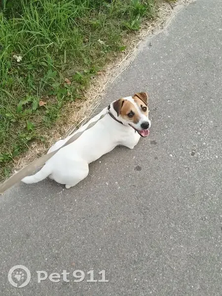 Джек Рассел терьер , 3,5 года, довольно крупный, мускулистый, полностью белый, рыжие пятна только на морде. На нём была шлейка. Очень добрый домашний пес.