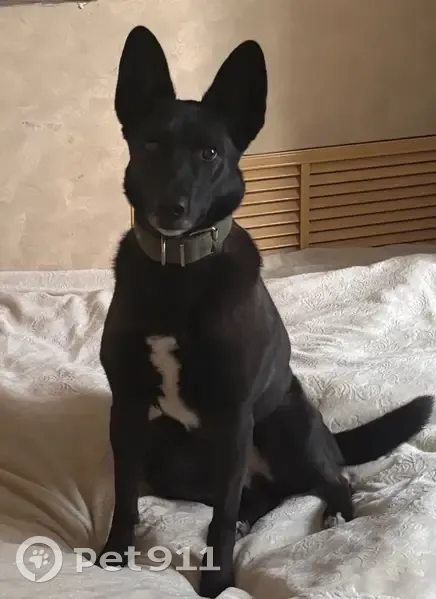 Метис, Карие глаза, Короткошерстная, Белая грудь, Острые стоячие уши, Черная окраска шерсти, Два ошейника:один вязаный, на котором жетон с номером тел. И имя, второй электронный черный. Трусливая, подойдет не сразу, может рычать и укусить пропала на прогулке по проселочной дороге. От лейпи к полям. В этот же день видели как бежала по асфальтной дороге по направлению в ковдор