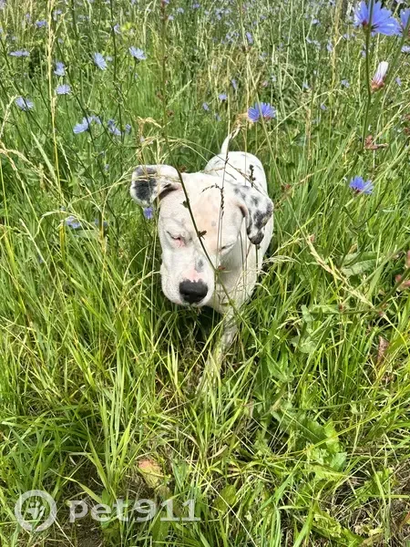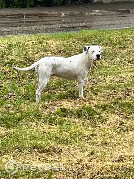 Собака породы Аргентинский дог, белая с черными пятнами(похожа на далматинца), нос и ушки черные. На ней был черный ошейник с металлическими кнопками. Откликается на кличку Айза.