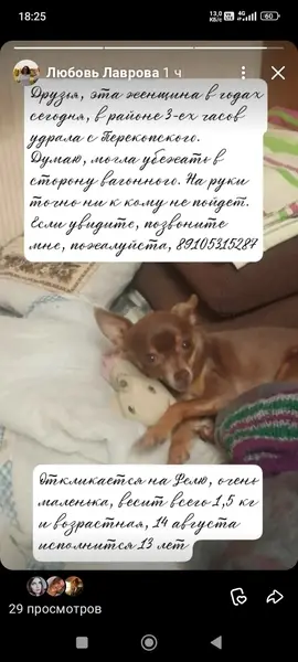 Той терьер мини, коричневая с рыжими подпалинами, очень маленька, весит 1,5 кг. Чуть пушистый хвост. Убежала с работы, видимо, испугалась работающих косилок