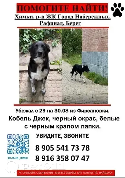 Химки МО, пропала собака. Убежал с 29 на 30.08 из Фирсановки и был замечен 3 сентября в Химках в районе Лобня ул Физкультурная вблизи Серафимовской церкви . Хозяйка ищет на месте, не успевает за ним. Кобель Джек чёрного окраса, лапы белые с чёрным крапом. Чат поиска t. Me/jack_himki 8(905)541-73-78, 8(916)358-07-47