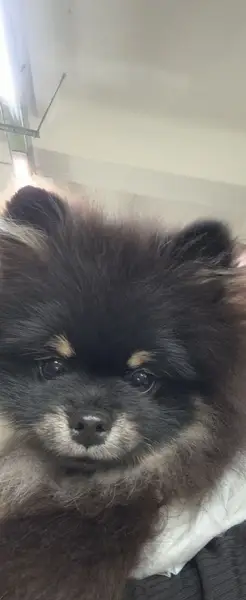 Черный шпиц именно в этом костюмчике. Кличка Мишка. Можно позвать: «Мишка! Миш! Миш, иди ко мне!» Добрый, ласковый! У него алопеция и ему нужен особый уход и витамины. Если он будет без костюмчика , то выглядит как лев (тельце лысенькое, а голова и лапки пушистые).