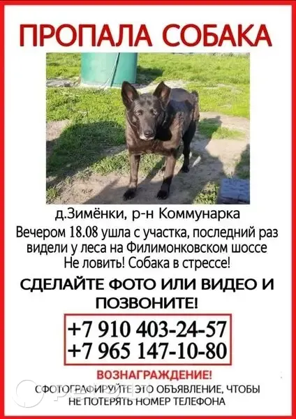 Черная, пожилая собака среднего роста. Кончик левого уха отсутствует. Хромает на заднюю лапу. Убежала с участка в деревне Зимёнки. (Коммунарка) Пугливая. Не подойдет. Очень просим позвонить, если увидите.