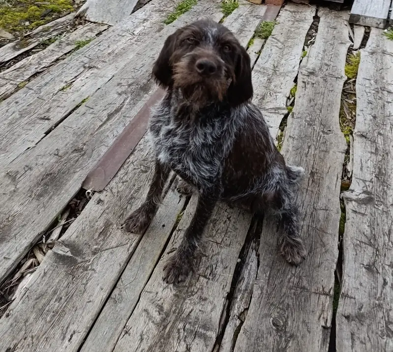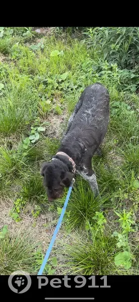 Собака породы дратхаар. Кличка Грета. Окрас черно-пегий. При беге закидывает переднюю лапу в сторону. На морде шрам. Пропала в лесу, в ходе прогулки, не доезжая деревни Черемша.