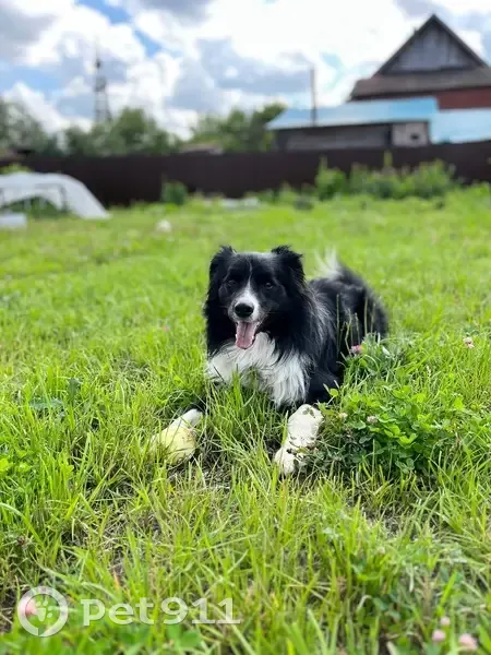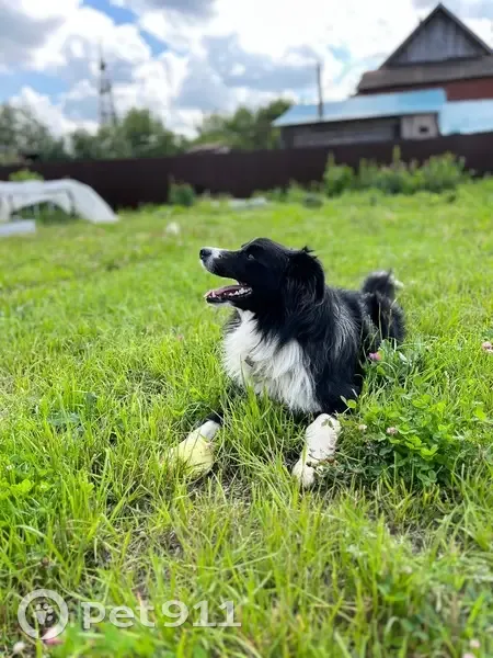 Черный с белым воротником. На нем зеленый ошейник с полосами, был адресник (с кличкой и номером телефона). Подрыл лаз под воротами участка и сбежал. К людям очень доверчивый. Не агрессивный.