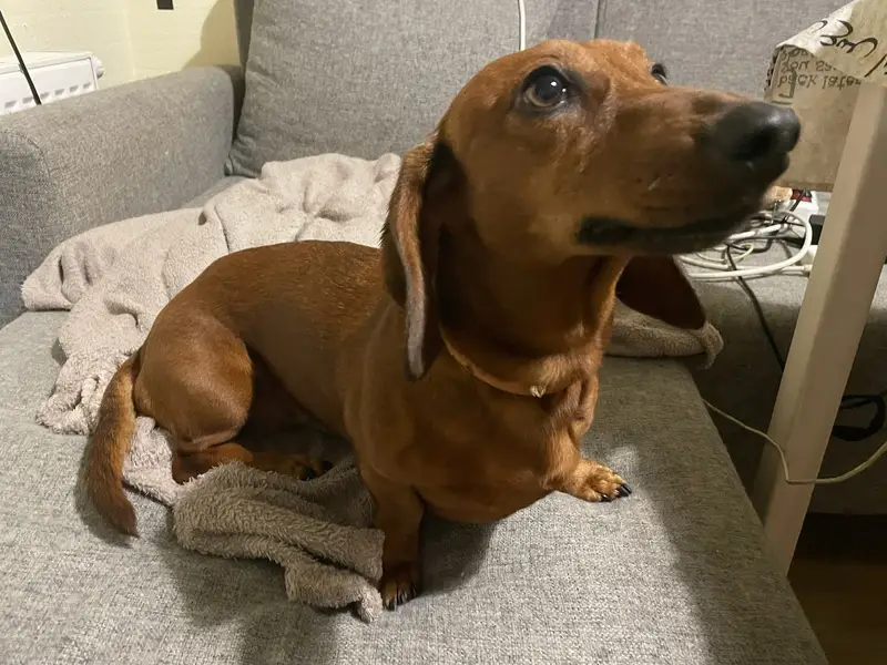 Рыжая, помесь таксы и пинчера. Кто-то увёз на машине от магазина"Пятёрочка"