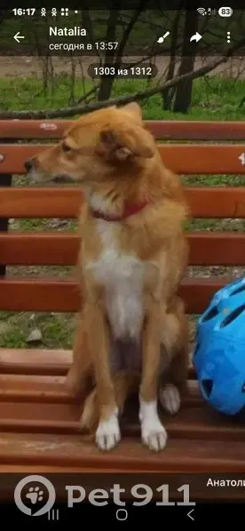 Рыжая собачка ,с белой грудкой, 40см в холке , на ней было два ошейника , один зелёный от блох, другой белый. Пугливая. Вышла из машины , и потерялась , примерно на досмотре в пробке на Крымский мост.