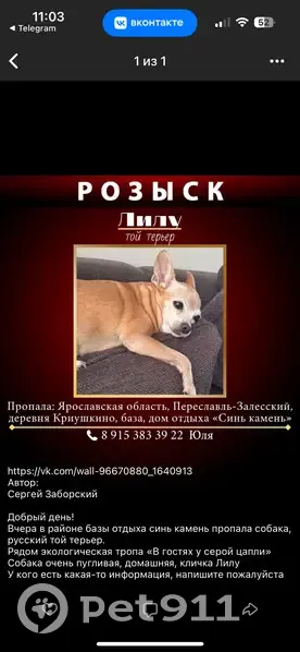 Добрый день! Вчера в районе базу отдыха синь камень пропала собака русский той терьер! Искали очень долго, так и не нашли… очень прошу, у кого есть какая-то информация, напишите пожалуйста! Нашедшему собаку вознаграждение гарантируем!!! Душа изболелась, места себе не находим. Собака домашняя, никогда никуда не убегала, просто за 5 минут пропала с базы…собака пугливая,домашняя,кличка Лилу мой номер телефона: +7-915-383-39-22 Юля