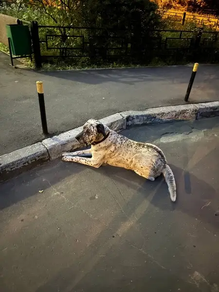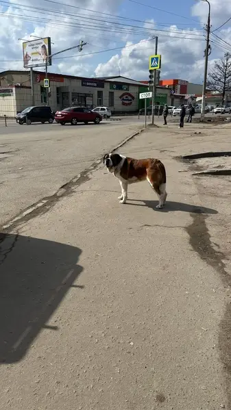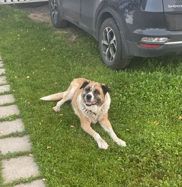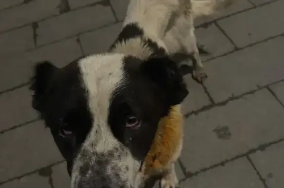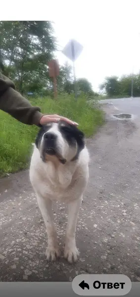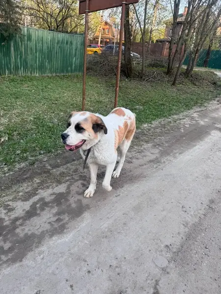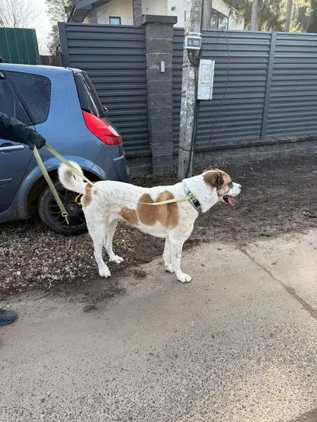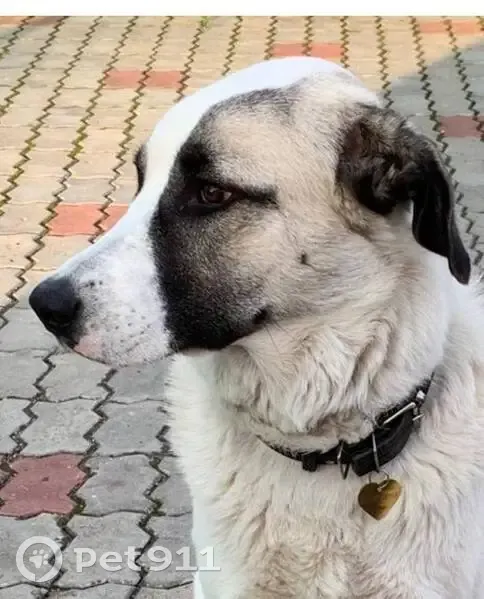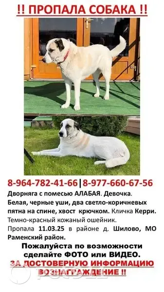ДВОРНЯГА С ПОМЕСЬЮ АЛАБАЙ(СУЧКА). На собаке БЫЛ темно-красный кожаный ошейник. Большая,белая, УШИ ЧЁРНЫЕ,на спине два светло-коричневых пятна,ХВОСТ КРЮЧКОМ,на морде характерная тёмная маска. НЕ АГРЕССИВНАЯ,ПУГЛИВАЯ,ЛЮБИТ ДЕТЕЙ.