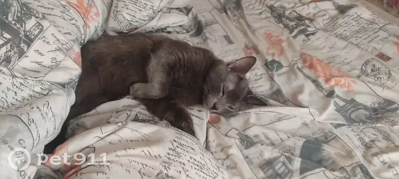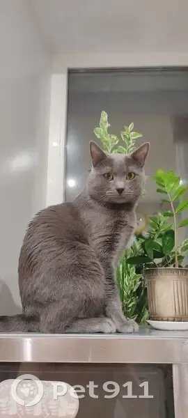Окрас серый, глаза жёлтые. Между глазами и ушами есть небольшая проплешина/лысина. Убежал от хозяйки на автобусной остановке через дорогу на юг, в лесополосу в сторону озера/реки Валава. В момент его побега на нём была шлейка фиолетового цвета с поводком(верёвкой)