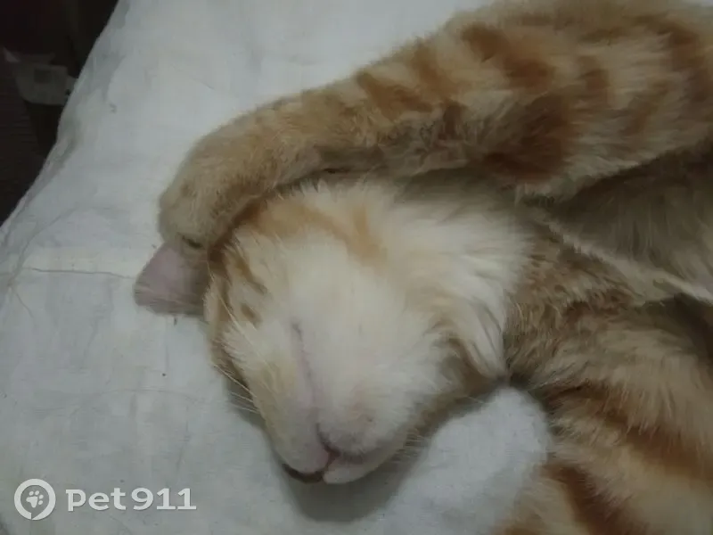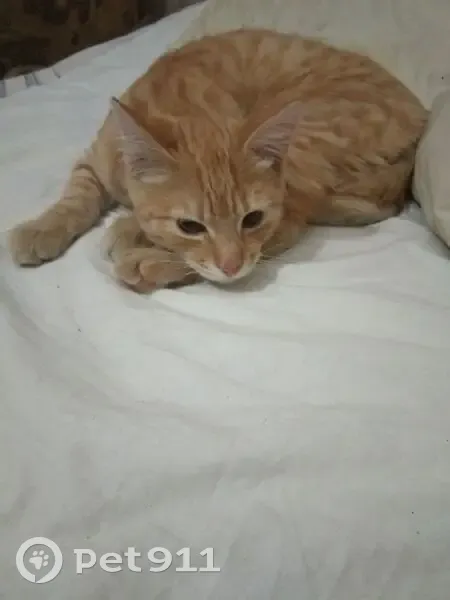 Худенький (ещё не взрослый на вид), рыжевато-беленькая полосатая грудка, задние и передние лапки, беленький подбородок, карие глаза, розовые подушечки на лапках, не агрессивный, любознательный, не пугливый, при находке был чистенький