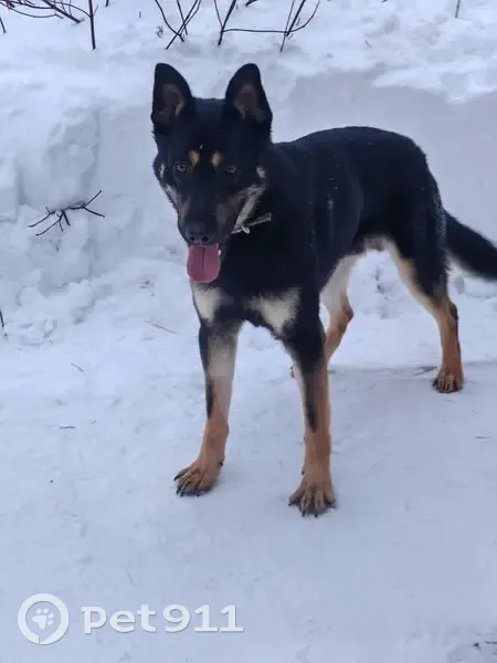 Найден молодой кобель, метис овчарки, возраст предположительно до года. Бежал вдоль дороги, чуть не угодил под колеса в районе с. Константиново Раменский р-н, МО. С ошейником болотного цвета, знает базовые команды. Окрас чёрный с рыжиной.