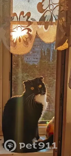 Окрас - черный. Ушки вислые. Галстучек белый на груди и лапки белые. Поравл сетку и выпал с этажа, на месте падения не нашли, не можем найти... Чистенький и ласковый.