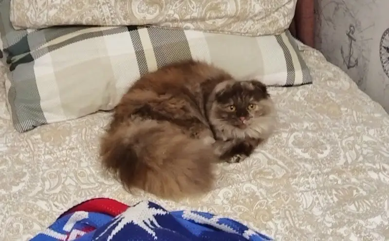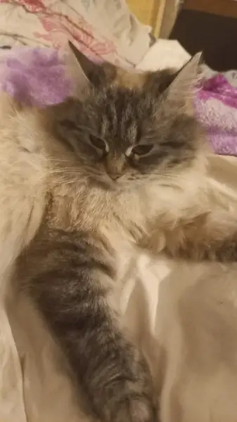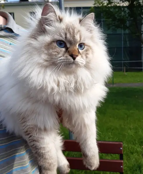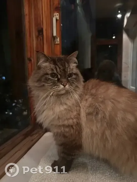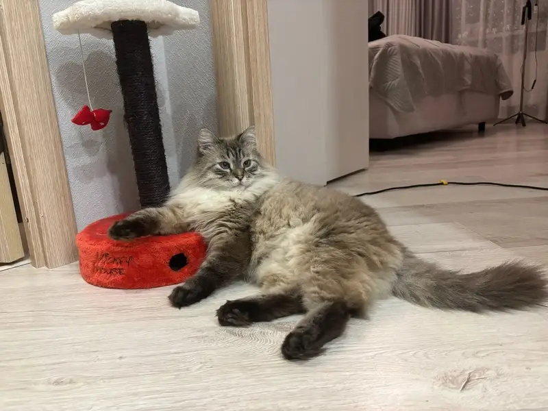 Похож(-а) на породу Невская маскарадная. Глаза голубые. Сидела недалеко от подъезда. Домашняя, не агрессивная.