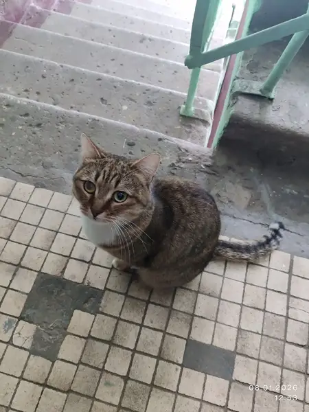Около двух или трех недель бегает между домами котик. Явно домашний, потому что испуганный и плачет - просится домой. Обычный полосатый кот. С белой манишкой. Довольно упитанный и чистый.