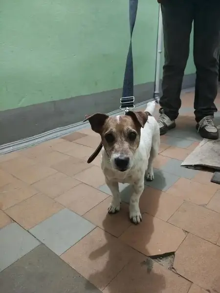 На голове симметричные коричневые поседевшие пятнышки, тело белого цвета, на шее за ушами, на задних лапах завитки, справа в районе плеча бородавка , правая передняя лапа сильно искривлена,собака старая, требуется лечение и особый режим питания!