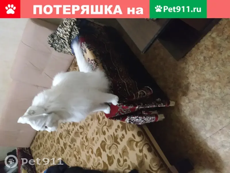 Кошка. Мейн-кун. Абсолютно белая, шерсть пушистая, кончик одного уха обрезан. Крупная. Кошка в синей шлейке. Возраст 3 года. Пропала в районе села Люторичи