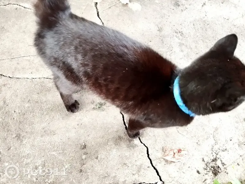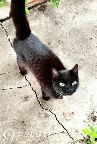 СНТ Цементник. Наведывается к нам с июля месяца в сад 758. Черная кошка, небольшая, чистая, ухоженная, с синим ошейником. Подкармливаем. Иногда она совсем голодная приходит, кушает всё!