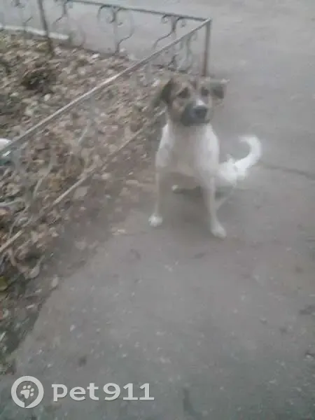 В течении месяца собака живет в районе вокзала, возраст больше года, может 2года, белая с рыжими яркими пятнами, сейчас уже подходит и ест с рук, ласковая, добрая,приучена к поводку.