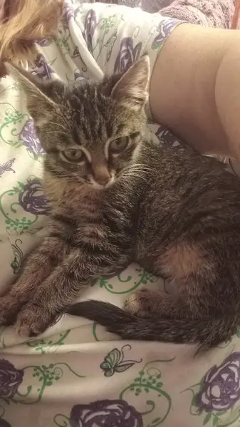 Окрас полосатый серого, чёрного цвета и немного рыжеватый. Упала с балкона на первом этаже. Ребята видели, что бегала, но потом пропала. Найти не получилось.