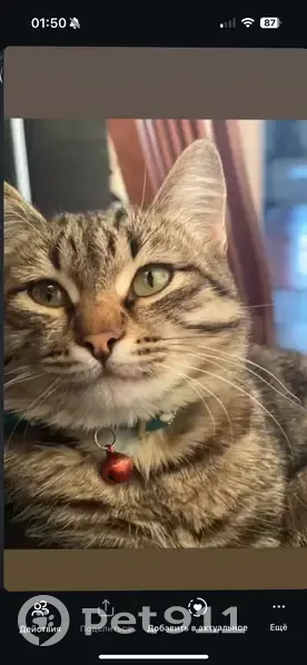 Внешний вид: Окрас:Кот имеет классический серый табби окрас. Его шерсть основного серо-коричневого цвета покрыта четкими, контрастными темными (почти черными) полосами, которые проходят по всему телу, включая лапы и хвост. Голова: Мордочка широкая, с заметными щеками. На лбу отчетливо виден характерный для табби-кошек "М"-образный узор. Вокруг глаз и по щекам также проходят темные полоски. Подбородок и область вокруг рта — белые. Нос — розовый. Глаза — зеленовато-карие, большие и овальные. Уши стоят прямо. Телосложение: Тело крупное, плотное и мускулистое. Вес — 3,5 кг. Дополнительные приметы: Коту 3 года, идет на контакт с человеком без проблем, страх собак
