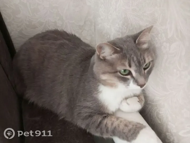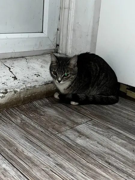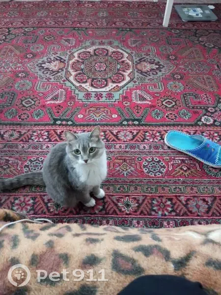 Серая в полоску, лапки на кончиках белые, животик и подьородок тоже. Упитанная. Носик коричневый, глазки зелёные. Боится чужих людей и громких звуков, начинает рычать или мяукать если трогать её хвост/лапки. Если ткнуть в лапку может резко мяукнуть. Есть родимое пятнышко темно серого цвета на задней лапке.