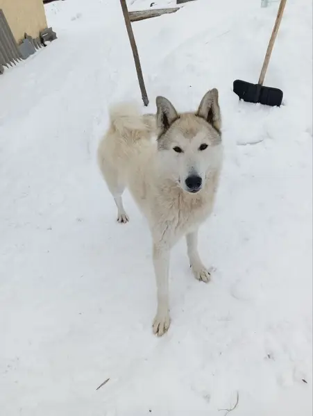 Западно-Сибирская лайка 10 лет, белого цвета, с бледно жёлтыми пятнами, высокий, красный ошейник, отзывается на кличку Норд, убежала в Агаповке, не можем найти 5ый день.