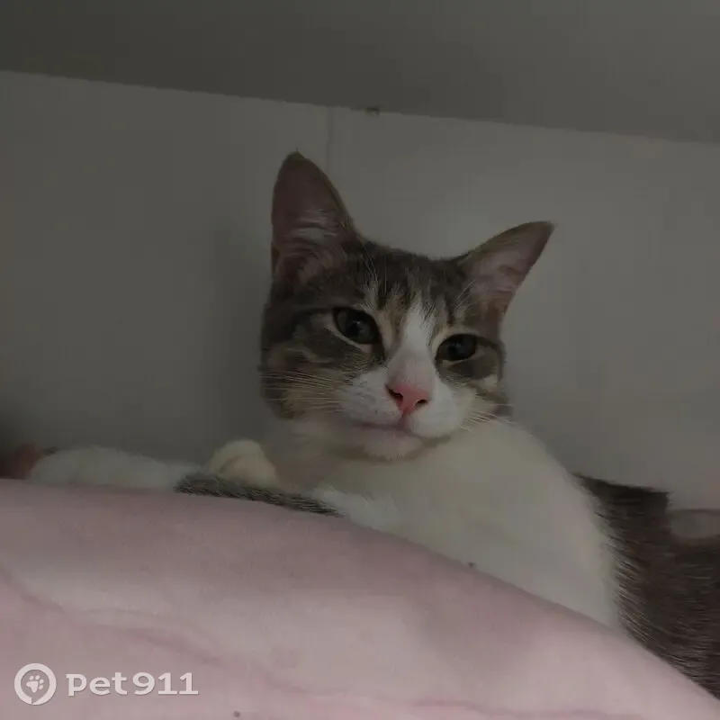 Окрас бело-серый. Розовый аккуратный носик. Котик очень ласковый,дружелюбный как с людьми так и с животными. Пугливый,так как очень боится улицы. Его вывели на рынок по словам знакомых там и оставили.