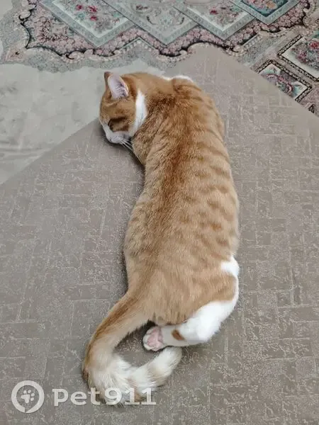 Выбежал когда мама открыла входную дверь. У него тёмно-жёлтые глаза, спина рыжая, но живот и лапы белые. Возможно, его можно будет опознать по хвосту. Он у него сначала более тонкий, а потом густой, из-за стрижки. На фото видно. Коту 10 месяцев, мальчик, крупный, около 4.5кг