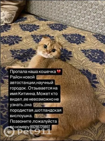 «ПОТЕРЯЛАСЬ КОШКА!» Отзывается на имя КИТИННА. Шотландская вислоушка. Домашняя кошка, не адаптирована к уличной среде. Кошка очень дорога нам, наш член семьи, дети очень ждут возвращения КИТИННЫ домой. Особая примета -кошка БЕРЕМЕННАЯ, и просто не выживет в такой мороз на улице!