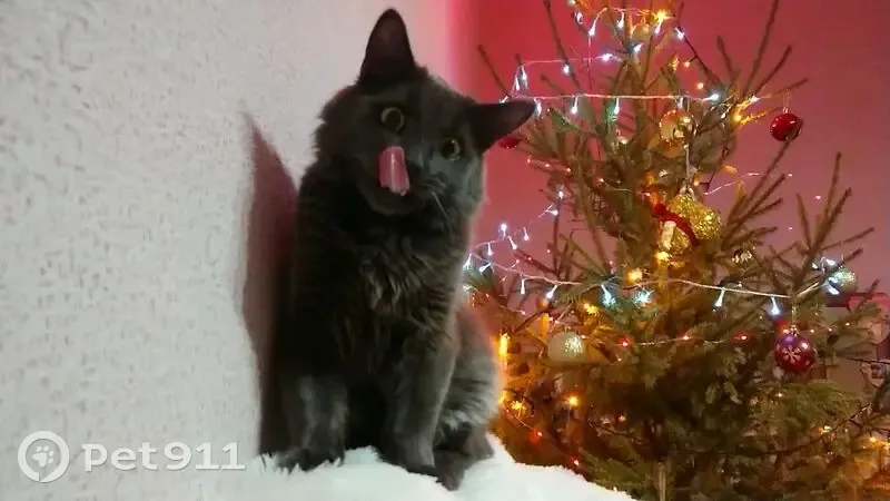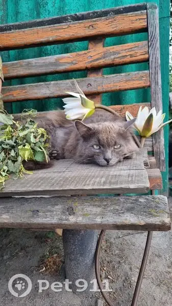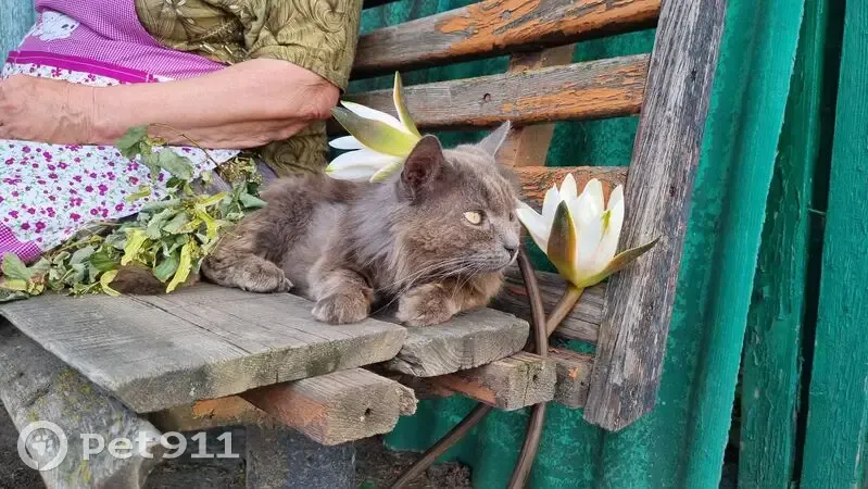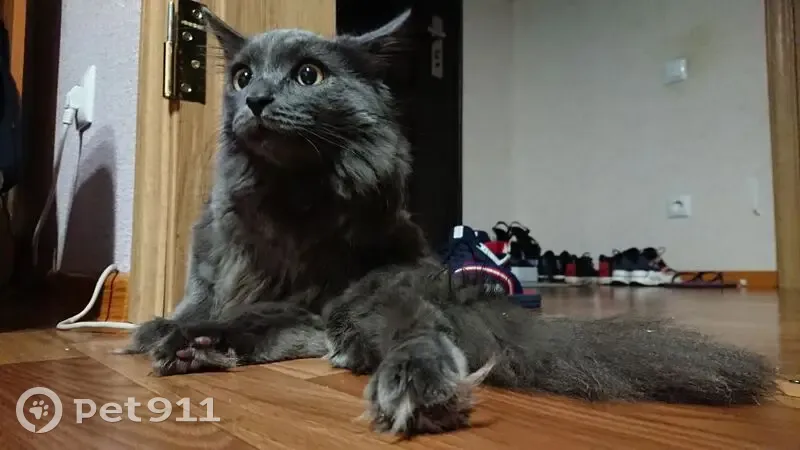 Пушистый, дымчато-серый, активный, солится на задние лапы, когда просит еду, между пальцев на лапах длинная шерсть, до войны откликался на кличку, спал рядом.