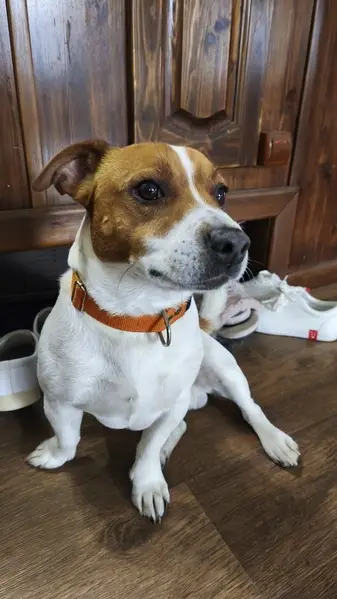Найдена собака, джек рассел, сука. Взрослая, очень ласковая и общительная. Найдена в пос Малаховка на ул. Республиканская 20. 10. 2019 в районе 23. 00. Клейма нет, на ней только противоблошиный ошейник. Тел 89037616206, Наталия