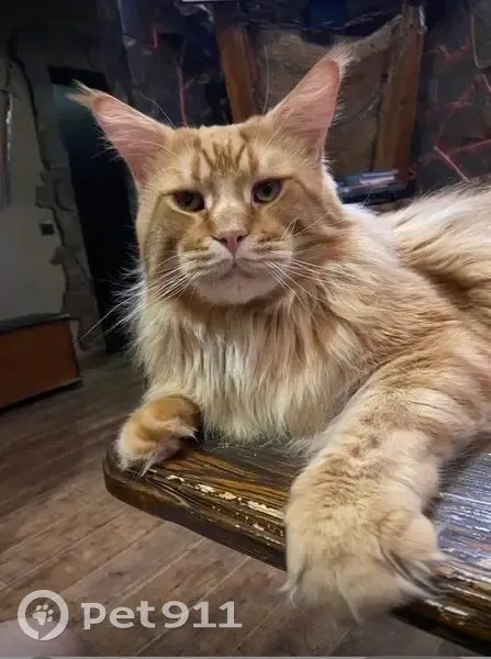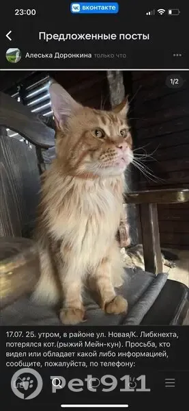 Рыжий окрас. После урагана образовалась брешь в заборе и он внезапно пропал утром 17.07.25. Крупный Мейнкун-кун, рыжий. Осторожный и непросто идёт на контакт. Некастрированный.