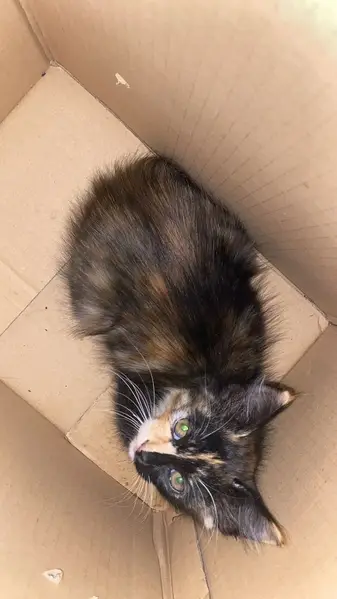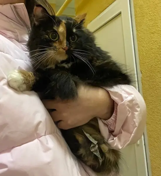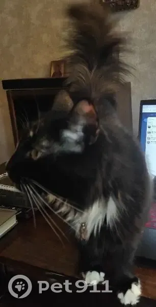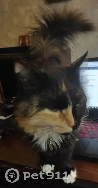 Пушистая. Окрас: черный, рыжий, белый. Цвет черный, с рыжим, половина мордочки рыжая, половина черная. Белые лапки. На шее был ошейник с брелком, в нем контакты владельца.