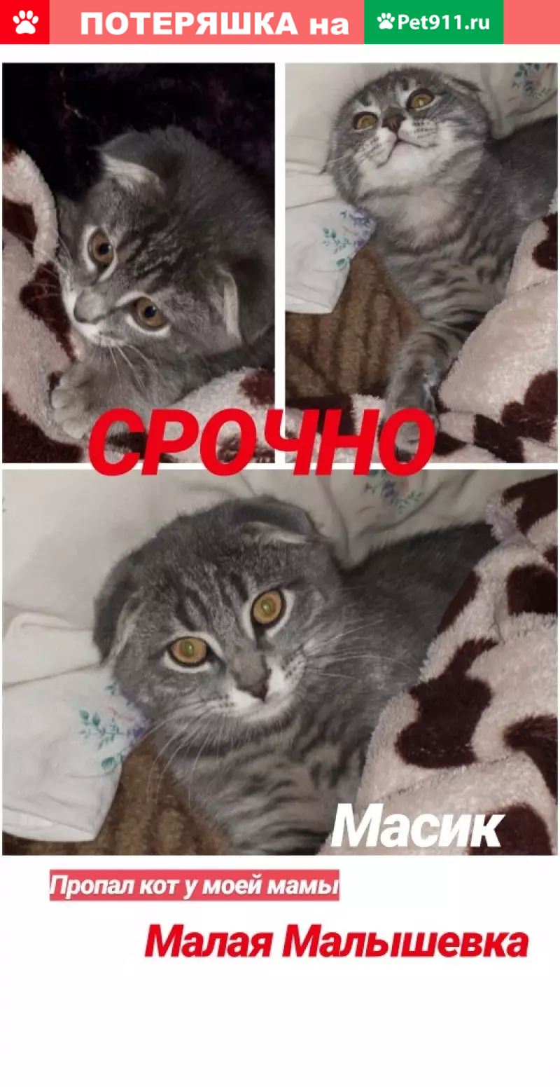 Малая Малышевка!!!!У моей мамы пропал кот сегодня в центре,Советская улица,за магазином. Если кто найдет,верните за вознаграждение!!!!!! в любое время звонить!