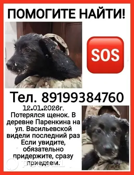 12.01.2026г. Потерялся щенок В деревне Паренкина на улице Васильевской видели последний раз 4-5 месяцев, по размерам подросший, не малявка Чёрный, белые лапки, кончик хвоста белый Если его кто-то придержал или приютил, сообщите пожалуйста! Если увидите, обязательно придержите, сразу приедем Звонить +7 (919) 938-47-60