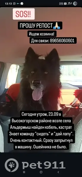 Крупный кобель кастрат, чёрного окраса с белым галстуком, длинношерстный, морда седая, белые пальцы на задней правой лапе, глаза янтарные. Фенотип немецкой овчарки. Знаком с поводком и ошейником, знает команду "сидеть" и "дай лапу". Бежал вдоль дороги от Мамонино до Альдермыша, озирался по сторонам, подбегал к машинам, остановилась, открыла дверь, сразу запрыгнул и мы поехали.