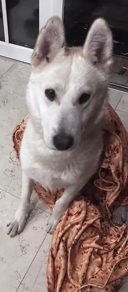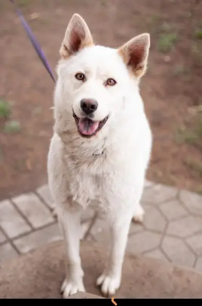 Бело рыжий окрас, игривая, коричневый ошейник, очень сильно линяет