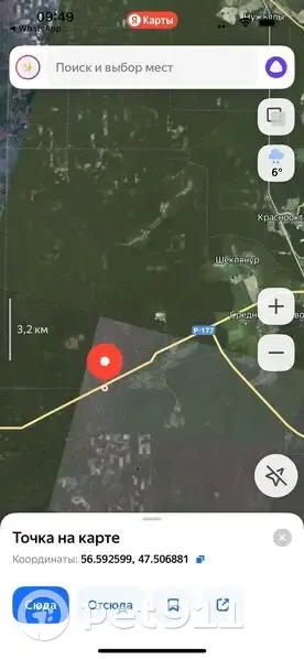 Здравствуйте в лесу бродит собака, видно что не первый день уже. Может кто из охотников потерял или у вас есть информация о хозяине и его ищут. Геометку прилагаю в фото