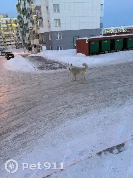 Пес похож на хаски или лайку, полностью белый, голубые глаза , розовый нос. Бегает по юго-западному району (Маркова) уже неделю