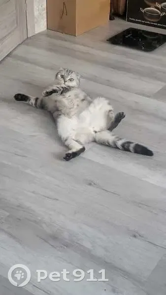 Шотландская вислоухая кошка. Откликается на «кися». Станет царапаться и шипеть, если потрогать, особенно зону вблизи хвоста и брюшко. Стерилизована. Подушечки на лапках — чёрные. Три года. Есть небольшое желтоватое пятнышко на груди. Пропала вчера вечером (в районе 23.00), но пропажа обнаружилась только сегодня в ~14:00-15:00.