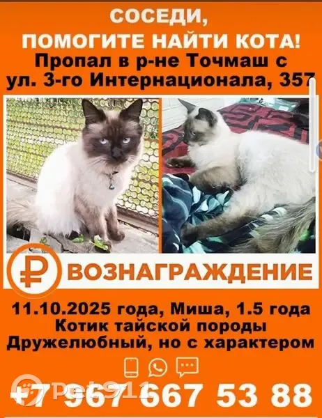 любознательный, любит путешествовать, добрый, умный, ласковый. Стерилизован после первого загула, 11 октября, по слухам подобрала молодая пара. Вознаграждение нашедшему моего Мишеньки будет обязательно.