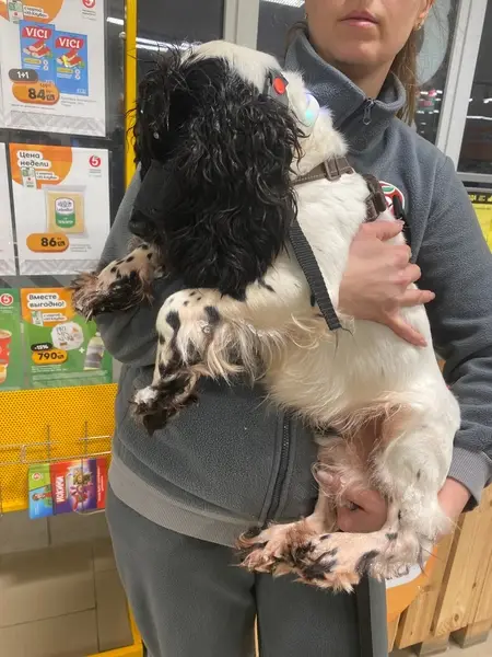 Порода спаниэль, пол неизвестен, найден замёрзшим у подъезда жилого дома, не встаёт, в ошейнике чёрного цвета
