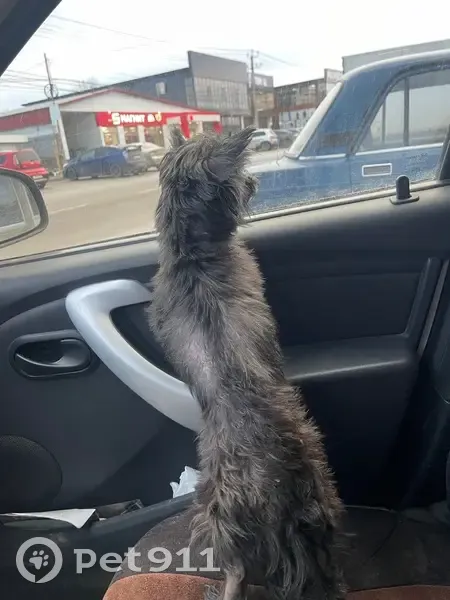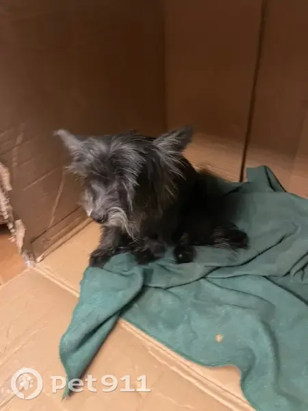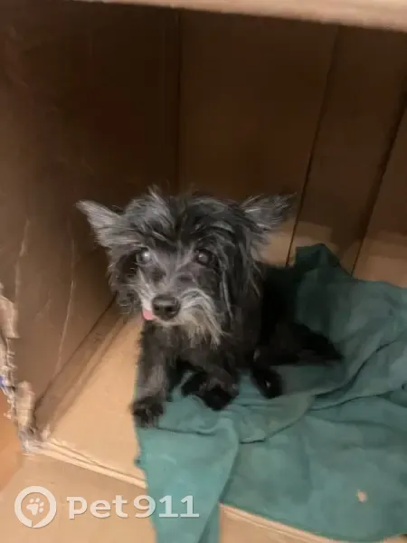 Миниатюрная собачка. Кажется, старенькая, девочка. Чёрная, явно не уличная порода, сильно дрожала, бегала от человека к человеку. Постоянно высунут язык набок. Поскуливает. Хорошо понимает когда указываешь направление, "пошли", "сюда", и тому подобное.