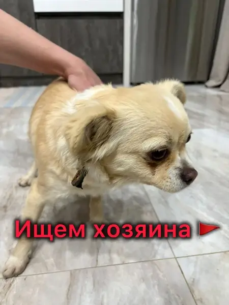 Поздно ночью сидел на крыльце. Около получаса прождали, ни кто не пришел. Забрали его временно к себе. У собаки был ошейник, похож на чихуахуа, размером меньше нашей кошки.