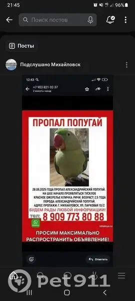28.06.2025г. Пропал Александрийский ожереловый попугай, возраст — 2,5 года, он откликается на зов Ричи, знает команду - "Иди сюда" если похлопать по руке может сесть. На шее у него появляется красное ожерелье. Если вы видели или слышали его, он кричит очень громко, пожалуйста. Был замечен в районе Гармонии.